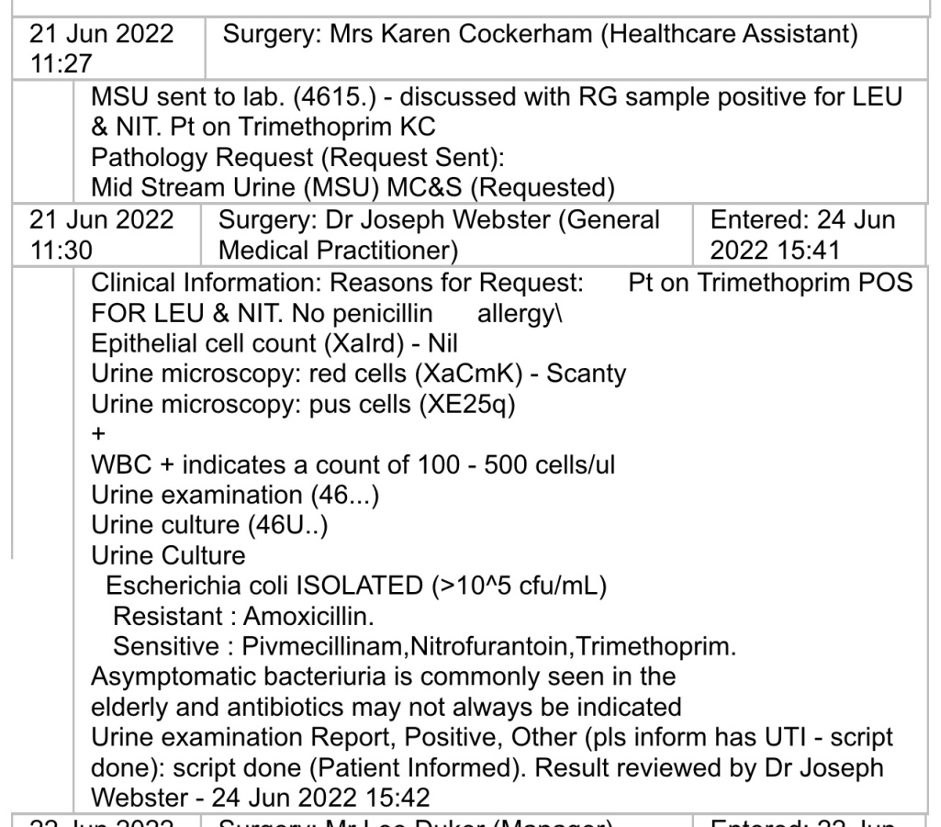 Social Worker Joanne Cave was not so reticent, and immediately on learning of the UTI infection caused to Mrs. X by her actions (being told by the Coucilโs Social Care Complaints office), rang Mrs. Xโs GP and attempted to obtain confidential medical information from the GP without the permission of Mrs. X and in full knowledge of the fact that such incitement to reveal confidential medical data would have been inducing the GP practice to breach data protection regulations & GDPR.