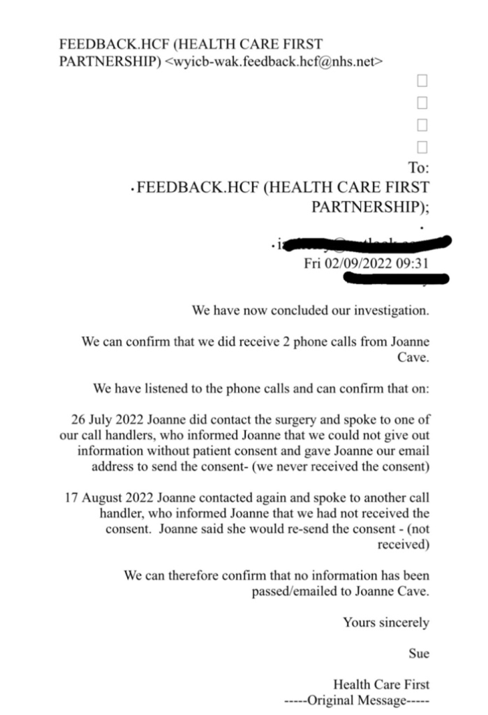 A copy of these call recordings were supplied to me in full by the GP practice together with the emails Social Worker Joanne Cave had sent to the practice.
