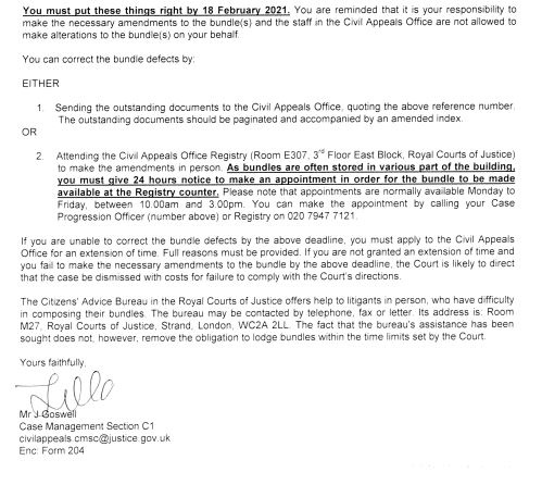 To go from September 2020 to February 2021 without identifying errors in a bundle and reverting to the Claimant five months later and only at the point at which the Claimant chases the matter up represents an unacceptable service level failure for which I now make a formal complaint to The Court Manager. The errors you state exist with the bundle are not present, as I have shown.