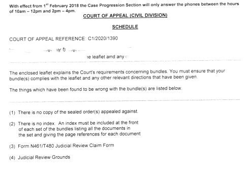 You state that there is no index. A copy of the index was supplied (index.doc). This shows the reference number for each of the following documents which corresponds to the number starting each document. As was a copy of the sealed order being appealed against (4). The Judicial Review claim form is at (12) and the grounds for JR both follow on from this. In other words all of the grounds you give for the bundle being in error are in fact present and correct and have been with your office since September 2020.