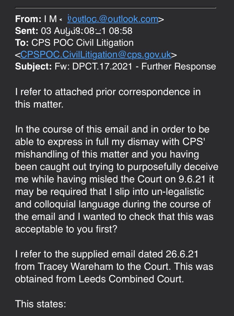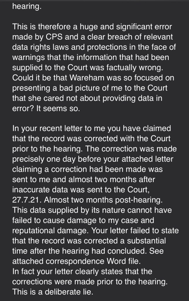 I refer also to the email to CPS in respect of their illegal retention of incorrect data on me and their sharing of this to third parties in June 2021.