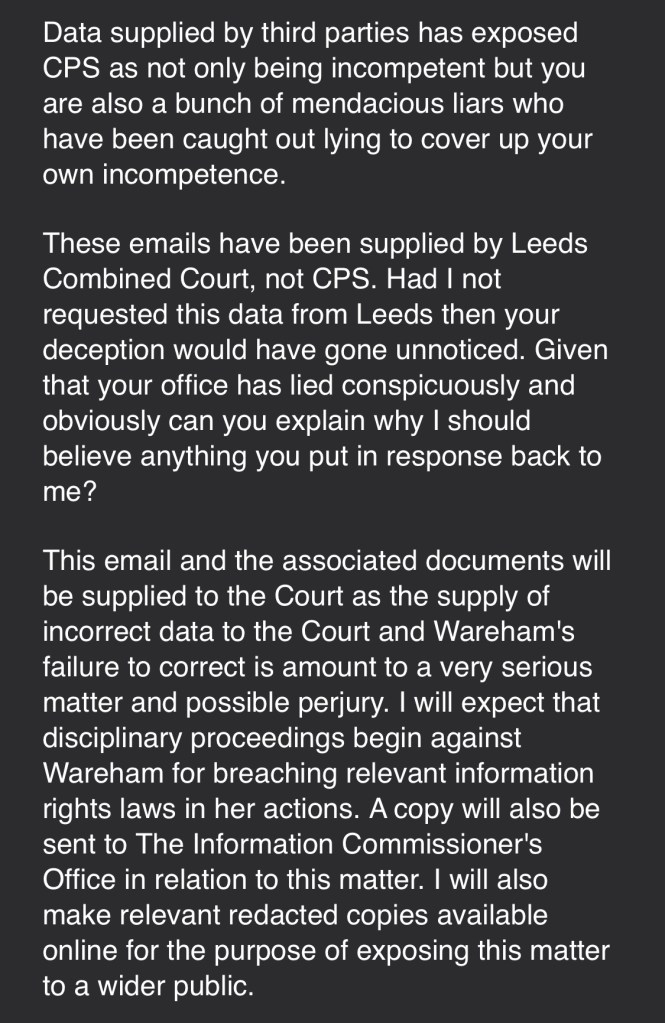 Donโt assume that The Crown Prosecution Service is out to tell the truth, be open or is even competent enough to get the basics right. If the opportunityโs there to gain advantage in any situation staff will behave mendaciously and allow their internal departments to try cover up for their behaviour. In this instance both the original person and the department have been significantly caught out. The court has been invited to take action in relation to the supply of a misleading statement in proceedings and The Information Commissionerโs Office has been informed.