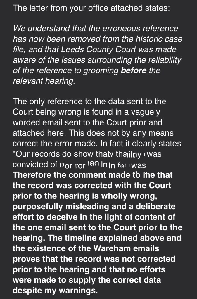 Copies of the emails between Wareham and the Court were supplied to me by Leeds Combined Court and show that no such efforts to correct the data in time were made.