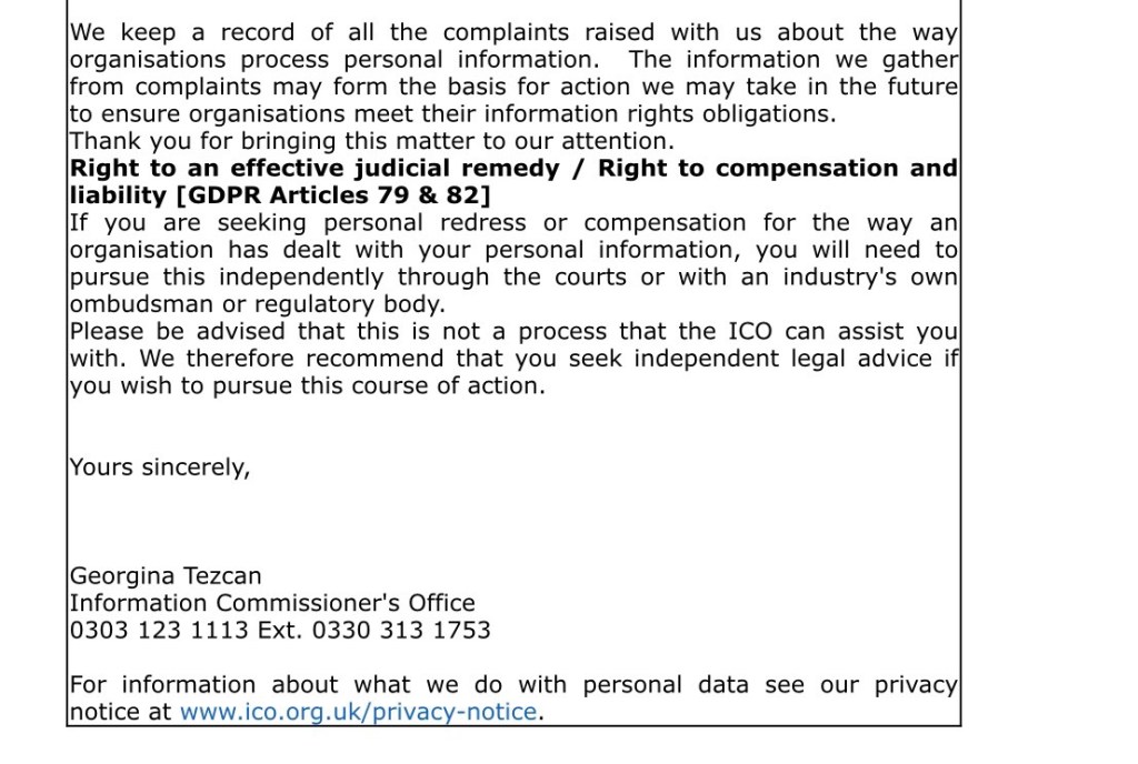 He of course failed to mention that the matter could be put to the First Tier Tribunal who deal with matters related to information rights issues and complaints about ICO handling of matters. Possibly this was deliberate to avoid such clear evasions of responsibility by ICO being adjudicated against.