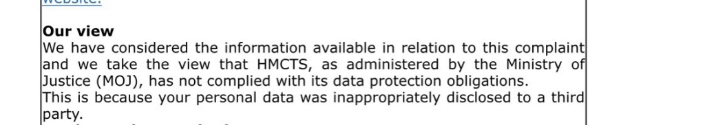 The letter from The Information Commissionerโs Office (ICO) finding against HMCTS can be seen below.