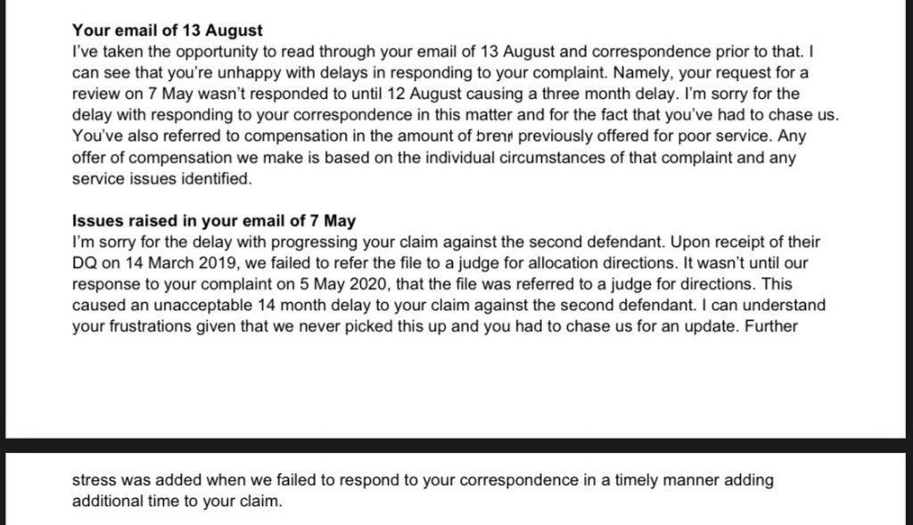 Consequently I appeal the second stage response on the basis that both that and the first stage response are wholly mendacious and fail to accept that a serious service level failure amounting to a breach of my Article 6 rights has occurred. The situation is no different to that of [REDACTED] in which the same Court Manager was aware that no action was taken in a claim for over a year but failed to respond to complaints in respect of that service level failure.